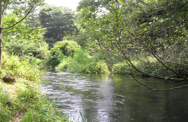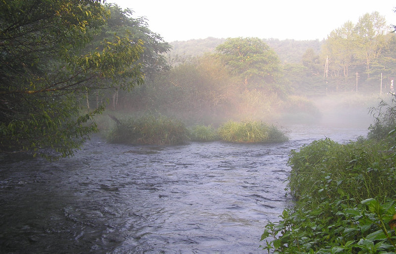 熱帯夜で睡眠不足・・・・夜明け前の出発です。陽が昇る頃、山女のライズを狙って竿を振るも、